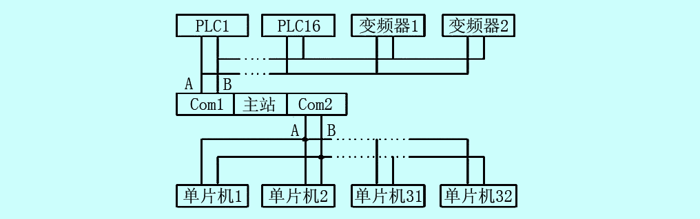 输速率不同,通讯可靠性会受到影响。网络节点数与所选器件中RS-485芯片驱动能力和接收器的输入阻抗有关。考虑到此控制系统中网络节点数较多,整个网络超过50个节点,为保证通讯的可靠性和提高通讯效率按照个器件在系统中实现的不同功能、数据流量、实时性要求把各器件分布到两条总线上,而且所选器件中的RS-485芯片驱动能力均达到255点,通讯速率选9.6bps,离主站最远的节点不超过50m。