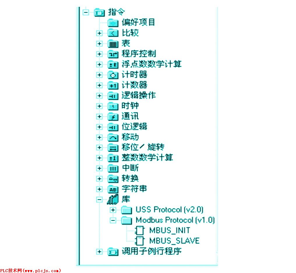 (2) 检查Micro/WIN的指令树中是否存在Modbus RTU从站指令库(图1),库中应当包括MBUS_INIT和MBUS_SLAVE两个子程序。如果没有,须安装Micro/WIN32 V3.2 Instruction Library(指令库)软件包,如图1所示。