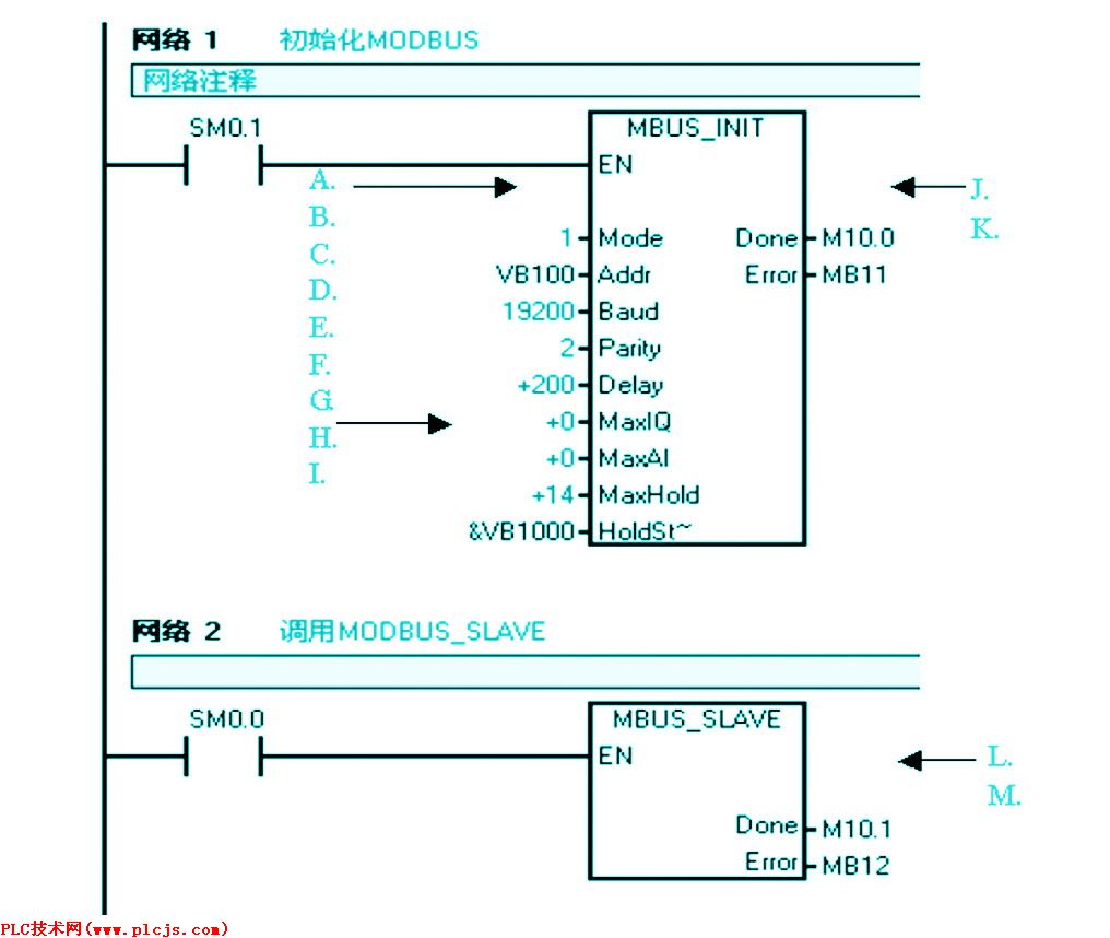 (3) 编程时使用SM0.1—调用子程序MBUS_INIT进行初始化,使用SM0.0—调用研究MBUS_SLAVE,并指定相应参数。关于参数的详细说明,可在子程序的局部变量表中找到。