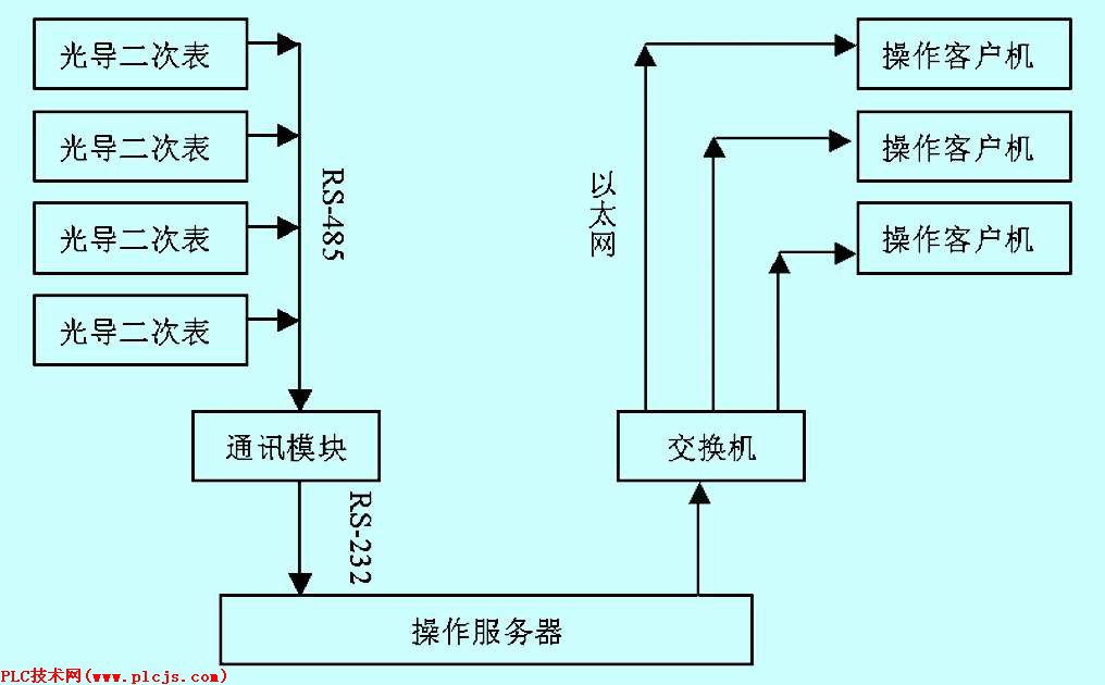 串行通讯(无论是RS-232还是RS-485)只是点对点的通讯,因此可以将4台光导液位二次表接入一台操作服务器上,另三台操作客户机从操作服务器取数据。这样就能满足上述要求,如图1所示。