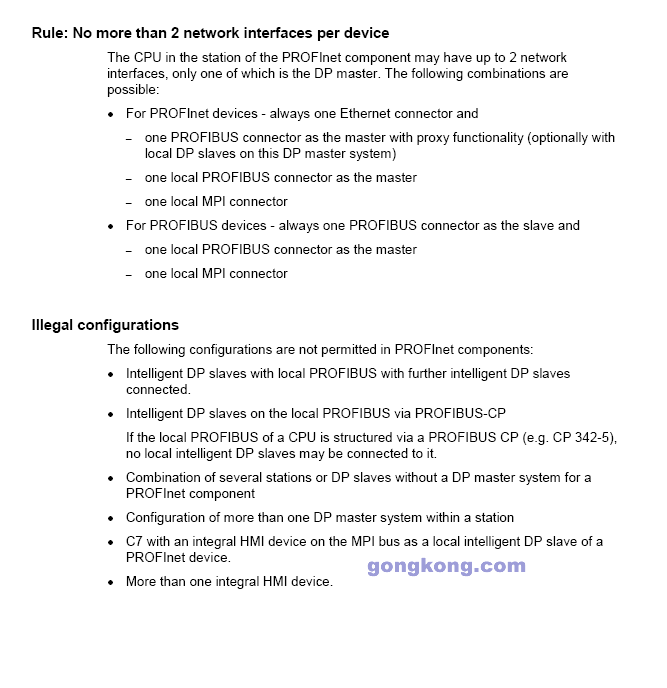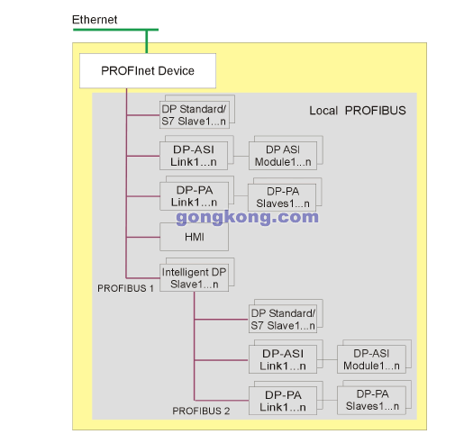 在进行下面的分析之前我们先对谈到的两类设备做一个简单的范围界定。 PROFInet 设备 一个 PROFInet 设备一般都有一个以太网接口,另外还可能有一个 PROFIBUS 连接器作为一个代理的PROFIBUS 主站设备. PROFIBUS 设备 一个PROFIBUS 设备一般有一个PROFIBUS 连接器,一般为从站它不直接参与PROFInet的通讯但是通过 PROFInet设备集成在一起. 分为以下两种: • PROFIBUS 设备带编程功能,可以运行程序,如 "intelligent" DP 从站. • PROFIBUS 设备只有固定的功能- DP 标准从站或者 没有自己运行程序能力的S7从站。如图。 ![]() 下面我们看看这两种设备的特点: ![]() Maximum configuration for a PROFInet device with a local PROFIBUS ![]() Maximum configuration for an intelligent PROFIBUS device with local PROFIBUS 另外还需要注意下面的规则: ![]() |