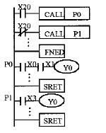 (2)在调用条件相反的两个子程序中,允许出现双线圈现象,即同一元件的线圈可以在两个子程序中分别出现一次。图3中X20为ON时调用在指针P0 处开始的子程序,X20 为 OFF 时调用在指针 P1 处开始的子程序。图中的 SRET 为子程序返回指令,FEND 为主程序结束指令。