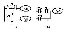 由 P L C 的工作原理可知,PLC程序执行的结果(即运算得到的线圈的通断状态),马上就可以被后面的逻辑运算使用。Y0的线圈的通断状态除了对外部负载起作用外,通过它的触点,还可能对程序中别的元件的状态产生影响。图1a中Y0两个线圈所在的电路将