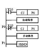 (1)在跳步条件相反的两个程序段(如自动程序和手动程序)中,允许出现双线圈现象,即同一元件的线圈可以在两个程序段中分别出现一次。图2中的X10是自动/手动切换开关,当它为ON 时将跳过自动程序,执行手动程序;为OFF时将跳过手动程序,执行自动程序。实际上CPU 只执行正在处理的程序段中双线圈元件的线圈输出指令。