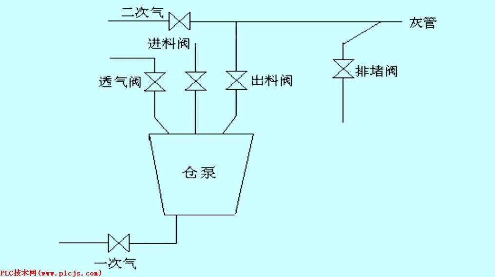 锅炉烟气中的灰尘通过电收尘收集后落入灰仓,灰仓下部安装有仓泵,灰经输灰管进入仓泵。在自动控制运行工况下,具体工艺流程为:仓泵内无灰时,打开透气阀→延时5s→开进料阀→延时5s→当仓泵进料量达到设定值(时间/重量/人工)时→料位信号到→关闭进料阀→延时5s→关闭透气阀→此时判断母管压力是否到位/判断灰管压力是否到位/判断在此系统中没有其它仓泵出灰,所有条件满足→打开出料阀→延时5s→打开一次气阀→延时5s→打开二次气阀1min后→检查灰管压力,当灰管压力低于设定值时→关闭一次气阀→延时20s后→关闭二次气阀→关闭出料阀完成一次出灰循环。
