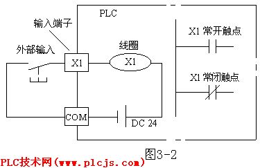 图1 输入继电器的等效电路 输入继电器必须由外部信号驱动,不能用程序驱动,所以在程序中不可能出现其线圈。由于输入继电器(X)为输入映象寄存器中的状态,所以其触点的使用次数不限。 FX系列PLC的输入继电器以八进制进行编号,FX2N输入继电器的编号范围为X000~X267(184点)。注意,基本单元输入继电器的编号是固定的,扩展单元和扩展模块是按与基本单元最靠近开始,顺序进行编号。例如:基本单元FX2N-64M的输入继电器编号为X000~X037(32点),如果接有扩展单元或扩展模块,则扩展的输入继电器从X040开始编号。 | |