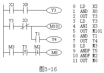 图1 触点串联指令的使用 触点串联指令的使用的使用说明: 1)AND、ANI、ANDP、ANDF都指是单个触点串联连接的指令,串联次数没有限制,可反复使用。 2)AND、ANI、ANDP、ANDF的目标元元件为X、Y、M、T、C和S。 3)图1中OUT M101指令之后通过T1的触点去驱动Y4称为连续输出。 |