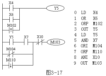 图1 触点并联指令的使用 触点并联指令的使用说明: 1)OR、ORI、ORP、ORF指令都是指单个触点的并联,并联触点的左端接到LD、LDI、LDP或LPF处,右端与前一条指令对应触点的右端相连。触点并联指令连续使用的次数不限; 2)OR、ORI、ORP、ORF指令的目标元件为X、Y、M、T、C、S。 |