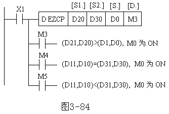 图3-83 二进制浮点数比较指令的使用 (2)二进制浮点数区间比较指令EZCP(FNC111) EZCP(P)指令的功能是将源操作数的内容与用二进制浮点值指定的上下二点的范围比较,对应的结果用ON/OFF反映在目标操作数上,如图3-84所示。该指令为32位运算指令,占17个程序步。源操作数可以是K,H和D;目标操作数为Y、M和S。[S1.]应小于[S2.],操作数为常数时将被自动转换成二进制浮点值处理。