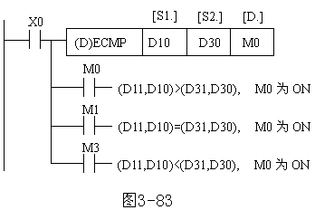 浮点数运算指令包括浮点数的比较、四则运算、开方运算和三角函数等功能。它们分布在指令编号为FNC110~FNC119、FNC120~FNC129、FNC130~FNC139之中。 (1)二进制浮点数比较指令ECMP(FNC110) DECMP(P)指令的使用如图3-83所示,将两个源操作数进行比较,比较结果反映在目标操作数中。如果操作数为常数则自动转换成二进制浮点值处理。该指令源操作数可取K、H和D,目标操作数可用Y、M和S。为32位运算指令,占17个程序步。