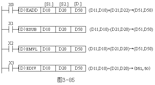 图3-85 二进制浮点数四则运算指令的使用 二进制的浮点运算还有开平方、三角函数运算等指令,在此不一一说明。 |