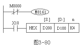 图 3-79 HEX→ASCII码转换指令的使用 ASCII→HEX指令HEX(P)的功能与ASCI指令相反,是将ASCII码表示的信息转换成16进制的信息。如图3-80所示,将源操作数D200~D203中放的ASCII码转换成16进制放入目标操作数D100和D101中。只有16位运算,占7个程序步。源操作数为K、H、KnX、 KnY、KnM、KnS、T、C和D,目标操作数为 KnY、KnM、KnS、T、C、D、V和Z。