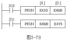 外围设备(SER)指令包括串行通信指令RS(FNC80)、八进制数据传送指令PRUN(FNC81)、HEX→ASCII转换指令ASCI(FNC82)、ASCII→HEX转换指令HEX(FNC83)、校验码指令CCD(FNC84)、模拟量输入指令VRRD(FNC85)、模拟量开关设定指令VRSC(FNC86)和PID运算指令PID(FNC88)8条指令。 (1)八进制数据传送指令 八进制数据传送指令(D)PRUN(P)(FNC81)是用于八进制数的传送。如图3-78所示,当X10为ON时,将X0~X17内容送至M0~M7和M10~M17(因为X为八进制,故M9和M8的内容不变)。当X11为ON时,则将M0~M7送Y0~Y7,M10~M17送Y10~Y17。源操作数可取KnX、KnM,目标操作数取KnY、KnM,n=1~8,16位和32位运算分别占5个和9个程序步。