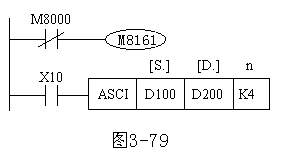 图 3-78 八进制数据传送指令的使用 (2)16进制数与ASCII码转换指令 有HEX→ASCII转换指令ASCI(FNC82)、ASCII→HEX转换指令HEX(FNC83)两条指令 HEX→ASCII转换指令ASCI(P)的功能是将源操作数[S.]中的内容(十六进制数)转换成ASCII码放入目标操作数[D.]中。如图3- 79所示,n表示要转换的字符数(n=1~256)。M8161控制采用16位模式还是8位模式。16位模式时每4个HEX占用1个数据寄存器,转换后每两个ASCII码占用一个数据寄存器;8位模式时,转换结果传送到[D.]低8位,其高8位为0。PLC运行时M8000为ON,M8161为OFF,此时为16位模式。当X0为ON则执行ASCI。如果放在D100中的4个字符为OABCH则执行后将其转换为ASCII码送入D200和D201中,D200高位放A的ASCII码41H,低位放0的ASCII码30H,D201则放BC的ASCII码,C放在高位。该指令的源操作数可取所有数据类型,目标操作数可取KnY、KnM、KnS、T、C和D。只有16位运算,占用7个程序步。