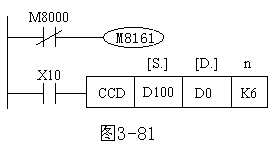 图3-80 ASCII→HEX指令的使用 (4)校验码指令 校验码指令CCD(P)(FNC84)的功能是对一组数据寄存器中的16进制数进行总校验和奇偶校验。如图3-81所示,是将源操作数[S.]指定的D100~D102共6个字节的8位二进制数求和并“异或”,结果分别放在目标操作数D0和D1中。通信过程中可将数据和、“异或”结果随同发送,对方接收到信息后,先将传送的数据求和并“异或”,再与收到的和及“异或”结果比较,以此判断传送信号的正确与否。源操作数可取KnX、 KnY、KnM、KnS、T、C和D,目标操作数可取KnM、KnS、T、C和D,n可用K、H或D,n=1~256。为16位运算指令,占7个程序步。