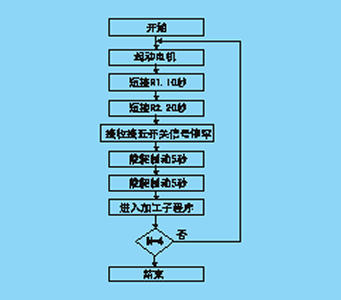 可编程序控制器(PLC)流程图如图2 所示,控制电路由可编程控制器来完成,当电动机降压起动,正常运转后,PLC控制KM2闭合,短接电阻R1,延时后KM3闭合短接R2,全压运转,带动圆型工作台顺时针转动,接近1/4圈处时,运转到挡片挡住接近开关,给PLC发信使电机供电停止,由于惯性继续运转,此时电源通过二极管整流,使电机能耗制动立即停转,然后电机降压反转10s后停止,同时死挡铁转过定位块反转碰到定位块后定位,准确停止在1/4圈位置,完成此工位的加工,然后重复上述动作完成下一工位的加工,四个工位全部完成后,停车,工人可以上下工件。下一个工件装好后,工人可按按钮启动或脚踩脚踏开关重新起动电动机完成下一个工件的加工。