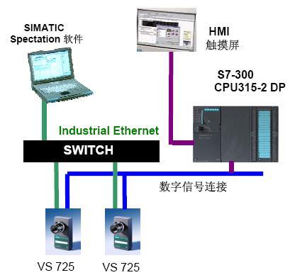 生产线的速度是360 包/分钟,即 6 包/秒。机器视觉系统包括: VS725智能相机、S7315-2 DP和HMI 触摸屏。