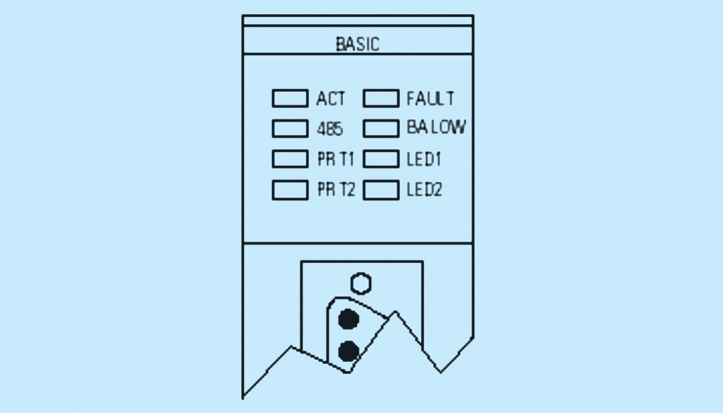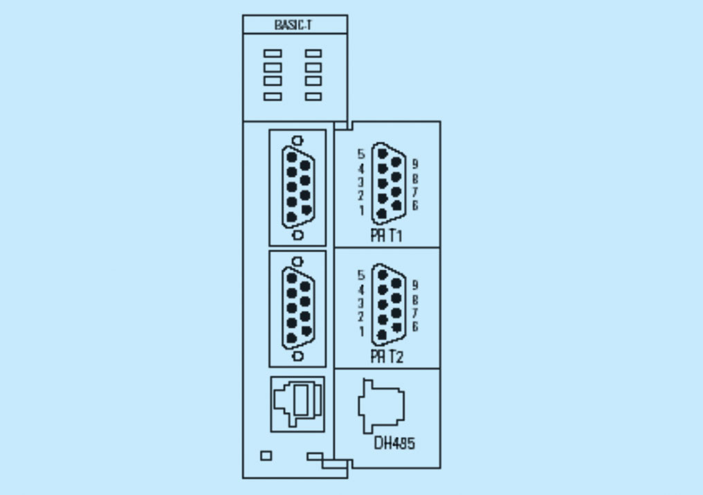 罗克韦尔自动化公司生产的BAS-T模件是用于SLC500系列PLC的一种高性能的通讯模件。BAS-T模件具有两个可编程的串口,支持RS-232、RS-422、RS-485通讯。它可以通过1746 I/O背板与一个SLC500 CPU通讯或者通过它自带的DH485端口与DH485网络通讯。在BAS-T模件内部有24kB电保持RAM,还可以选用8kB或32KkB的非电保持内存模块。BAS-T模件具有八个LED灯用来指示其工作状态。BAS-T模件的外观如图1。LED灯定义如图2。