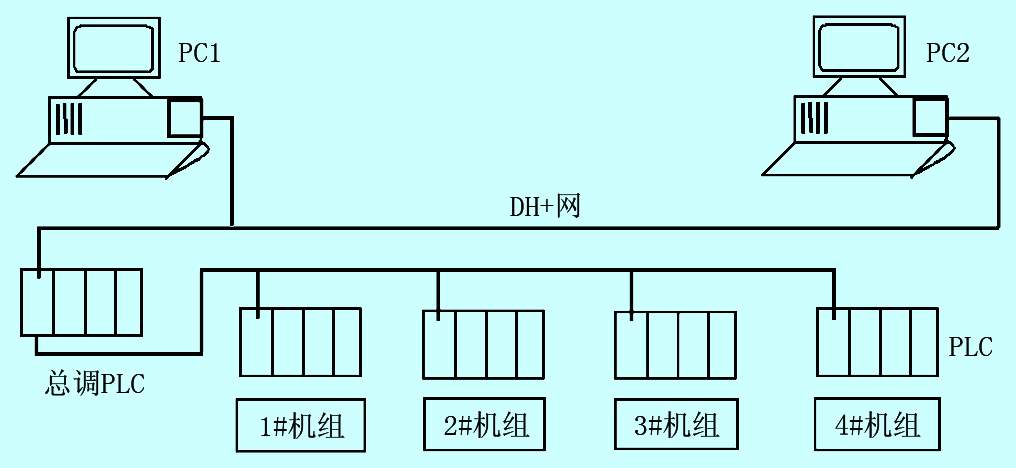 2 系统配置为了独立于保护和监控系统而自成一体,避免相互干扰和影响,稳流系统全部采用AB公司SLC-5/04系列PLC组网,该PLC具有专用的DH+通讯网,通过专用板卡直接可与服务器相连。PLC之间的信息交换通过DH+网络通讯来实现,图1为网络结构。