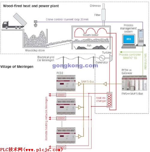 任务和目标 Meiringen是位于伯尔尼Oberland地区的一个4900个居民的村庄,周围群山环抱。自1995年11月,在这里建立了一座FHKWM木屑发电厂。该发电厂年生产1400万kWh的热能和200万kWh电能,基本上满足了Meiringen四分之一的需求。 夏季热能需求降低,蒸汽涡轮发电机进入空闲状态,这期间只生产服务用热水。总长为8000M的输热管网不仅提供44户私人住宅,还供应本地区的医院,学校,私人诊所,火车站,数家旅馆和许多商业机构。 该项目投入试运行后的前几年,出现了一些问题。到2000年,该项目以改善系统的可靠性及经济性为目标重新进行了开发。 系统实现 来自Baden的专业公司COLENCO不仅改良了该工程的机械部分,也改善了Simatic S5控制器的过程软件。相对照的是SAIA PCD4控制器不需要修改,它通过S-BUS和中继器保证了与大范围的用户进行通信,其软件和安装都是由MULLER系统公司于1995年完成的,而且也能满足更多的管理要求,MULLER公司用新版的LLTIS-PLS2管理系统替换了旧版的系统。 现在,2001年初该项目按计划全部投入商业运行,并且显著提高了系统的经济性能。该系统包括: ![]() 一台燃烧木屑的高压蒸汽锅炉,容量为4300kW 蒸汽涡轮发电机额定容量700kW 一台燃烧木屑的热水锅炉,容量为1850kW 一台燃油备份锅炉,热容量为2350kW 一台输送木屑从储存区到炉子的起重机 一台清洁废气的静电除尘设备 通向Meiringen的热水管道和用户本地的换热器 ![]() 如图所示,Simatic S5设备控制实际的过程,采用PROFIBUS FMS互相之间及与管理系统通信。为了获得木屑的最优累计量,要与起重机通过电流环连接直接进行通信。 一台SAIA PCD4 作为FMS链路的网关到SAIA S-BUS网络,保证了与主要用户的通信。10台PCD2提供备用锅炉的本地控制及热能数据记录。 主要优点 燃烧木屑的发电厂利用了来自Meiringen周围的25000M3的低级木材,代替了每年用于供热的1400吨燃油。生态能源被重新使用由于废气完全经过电子除尘设备的过滤,木屑发电厂的燃烧发生的污染很低本地的所有PCD2的软件都是相同的,个别参数可以通过管理系统来设置。 与PCD2的S-BUS通信通过中继器跨越8km从1995年到2001年的整个运行期,发电厂的PCD4和本地的PCD2保持了无故障运行从试运行起,当前的运行状态,数据存档,所有的趋势,报警和操作信息都已经归档,在任何时候都可以查看这些记录,这为系统的优化运行提供了条件。 项目 瑞士最大的燃烧木屑的发电厂,为Meiringen社区集中供暖和电力。过程控制采用Simatic S5设备并与外部的SAIA PCD控制器通信该项目在2000年进行了深入的重开发以提高系统的可靠性和经济性,同时安装了新版的监控系统LLTIS-PLS2,使其满足更高的管理要求。 技术信息 燃烧木屑的热电厂年生产能力 1400万kW热能 200万kW电能 热能由下列设备产生: 一台燃烧木屑的4300kW容量的高压蒸汽锅炉 一台燃烧木屑的1850kW容量的热水锅炉 一台2350kW的燃油热备分锅炉 涡轮发电机输出3×400VAC 700kW 木材消耗每年25000M3木屑 热能分配通过8000M管网输送给54家用户 过程控制7台SIEMENS的SIMATIC S5设备 与用户之间的通信1台SAIA PCD4 和10 台PCD2 数据点数约15000个 管理系统ILTIS-PLS2 网络SAIA S-BUS PROFIBUS FMS 与起重机通信20mA电流环(点对点) |