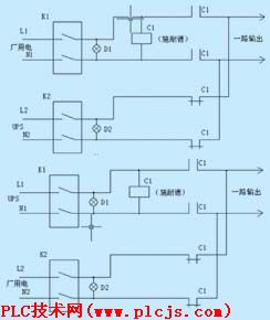 在供电配置上采用双路自动切换电路:一路UPS、一路厂用电,在正常时两套同时供电的方式,如图2所示。这种设计的问题是目前的切换接触器本身满足不了需要(图2中接触器型号为LC1D65008M5)。当供电电压跌落现象发生后没有积极采取补救措施,这就使得电能的质量没有保证,也就是说,在系统冲击时,电压跌落(C1其电压值还没有到接触器失压回位)问题已成为影响电能质量的一个重要因素,厂用电源提供的电源有时甚至到了供电设备不能正常工作的范围,电源系统不能提供可靠有效的供电电源。造成的后果是显而易见的。
