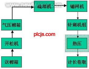 摘要:本文主要论述台达机电产品在针刺型无纺布生产线上的系统集成应用原理。项目展示了同构平台机电自动化产品的系统集成优势。 关键词:针刺机;变频器;人机界面;PLC 1 引言 无纺布在发达国家的日常生活和工业生产甚至土建工程和医疗卫生中有广泛的用途。自从1990年开始,中国通过引进欧洲光、机、电、气、液全自动化成套生产线设备,有了现代意义上的无纺布生产能力。根据机电工程的理念,现代无纺布是典型的高新自动化设备密集型产业。例如某上市公司自1990年开始全厂5条引进欧洲自动化生产线的PLC达到60余台套共计3700多I/O点;变频器达到120多台,永磁同步交流调速自冷密封电机在一套梳理机机组的集成直轴伺服传动达到23台,具有世界先进水平。5条线万吨年产能单班生产员工仅40人,拥有亚洲最先进的水刺型无纺布研发与生产能力。 无纺布的纺织工程学名叫做非织造布。非织造布工艺完全不同于传统的纺纱——织布过程,非织造布的最大特点是不需要纺纱过程,它的“织布”过程更加类似于造纸工艺,非织造布通常是在一条生产线上直接实现从纤维到成布的连续加工过程。非织造布生产线“吃”进去的是纤维,“吐”出来的是布。参见图1针刺型无纺布工艺过程,定向或随机排列的纤维通过摩擦、抱合、粘合或这些方法的组合,而相互结合制成的水平缠结薄片、纤维网或絮垫,经过针刺机组在垂直布面方向缠结成布。因为没有传统意义的纺纱织布过程,所以叫做无纺布。