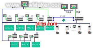 2 台达机电简介 从最早第一台变频器面世,台达机电至今已经能为客户提供PLC控制器、温度控制器、计数器、人机界面、变频驱动器、伺服驱动器、数控系统等一系列产品,已经有能力向客户提供完善可靠的机电一体化解决方案。汕头三辉企业是一家以生产无纺布机械为主的企业,与中达电通已有多年合作,对台达产品给予了强力支持与高度信任,并取得了非常良好的效果。本文主要以三辉企业生产的针刺机组生产线为例,简要阐述台达机电产品的整合应用及其优点。 3 自动化系统集成规划 3.1 总体技术路线 (1)PLC的存储容量和处理速度。整条生产线而言,数据运算及逻辑运算量很大,16K容量远远不够,单台PLC的处理速度将会影响生产的稳定性。 (2)针刺生产线的布局和设备操作。各机台是分散的,集中一地操作会为生产带来不便,但假如分散操作,必须会带来人机与PLC间的距离问题及PLC与受控单元的布线问题。 (3)设备组合方式。通常一条完整的生产线用户会采购生产设备厂家性能或价格有优势的产品,或根据自身生产的产品采用不同的设备组合,故每条生产线组合可能完全不同。 综上所述,为满足方便安装,方便整线整合,提高系统性能,本系统按照单机设计、自由组合方式设计(见图2、图3),即是每台针刺机使用一台PLC、一台人机、每台针刺机提供联机接口,不同需求用户组成生产线时控制上只要将各机台连上控制总线即可,单机程式不须做修改,改动内容仅在总控制器部分。