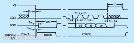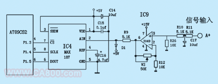 MAX187具有内部参考电压,既4#管脚(REF)为 4.096V,因此,A/D转换的全量程为4.096V。而输入信号是0~5V,因此,要加一级运放把0~5V转换成0~4.096V后送入MAX187。AT89C52的P1.3和MAX187的片选端(CS)相连、AT89C52的P1.4和MAX187的串行时钟信号端(SCLK)相连、AT89C52的P1.5和MAX187的串行数据输出端(DOUT)相连。模拟量采样的值存入单片机的内存中,再由单片机的串行口传送给PLC。A/D转换的C51程序如下: