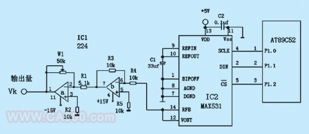 这里以一路12位模拟量输出为例,设计中将采用12位D/A转换芯片MAX531来实现数摸转换。我们在MAX531的输出端接运算放大器,将模拟输出调节至0~5V,输出部分的硬件电路如图3所示。这里,MAX531是12位串行D/A,具有较高的转换速度, MAX531具有内部参考电压,既10#管脚(REFOUT)为2.048V,因此, D/A转换的全量程为2.048V。而输出信号一般要求是标准的0~5V,因此,要加一级运放把MAX531输出的0~2.048V信号转换成 0~5V信号。AT89C52的P1.0和MAX531的串行时钟信号端(SCLK)相连、AT89C52的P1.1和MAX531的串行数据输入端(DIN)相连、AT89C52的P1.2和MAX531的片选端(CS)相连。PLC把要输出的模拟量通过串行口传送给单片机,存入的内存中,再由单片机完成D/A转换进行输出。A/D转换的C51程序如下: