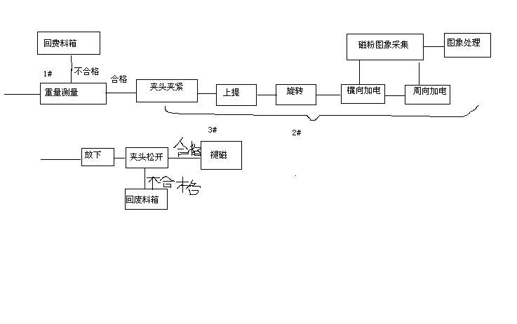 以上为一铁性零件的检测方框图,零件从生产线或仓库到1#工位进行重量检测,合格则到2#工位进行磁粉探伤检测,2#由一电机控制进行夹紧上提旋转等一系列机械动作,磁粉检测的磁粉图象有一摄象头采集,进行处理。合格的再进行消磁处理。
