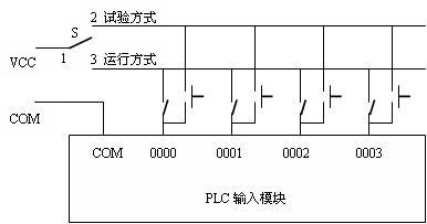 为节省输入口数量,节省投资,本系统运行/试验功能的转换采用了对I/O模块接线的优化,使PLC输入模块中1个输入节点起到2个输入节点的作用,完成PLC工作在两种方式下的I/O功能。参见图二I/O模块接线的优化。