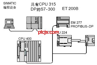 如图表示有一个CPU 224和一个EM 277 PROFIBUS-DP模拟的PROFIBUS网络。在种场合,CPU-315-2是DP主站,并且已通过一个带有STEP 7编程软件的SIMATIC编程器进行组态。CPU 224是CPU 315-2所拥有的一个DP从站,ET 200 I/O模块也是CPU 315-2的从站。S7-400 CPU连接到PROFIBUS网络,并且藉助于S7-400 CPU用户程序中的XGET指令,可从CPU 224读取数据。 |