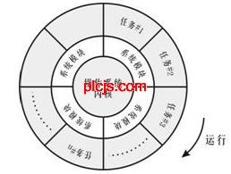 基于这样的操作系统,PCC的应用程序由多任务模块构成,这样给项目应用软件的开发带来了了很大的便利,因为这样可以方便地按控制项目中各部分不同的功能要求,如数据采集,报警,PID调节运算,通信控制等,分别编制出控制程序模块(任务),这些模块既相互独立运行,而数据间又保持一定的相互关联,这些模块经过分步骤的独立编制和调试完成之后,可一同下载至PCC的CPU中,在多任务操作系统的调度管理下,并行运行,共同实现项目的控制要求,这一特点,可图示如下: