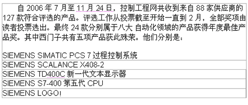 2007年3月29日,控制工程网2006/2007年度最佳产品奖颁奖典礼拉开序幕,西门子自动化系统部在本次年度评选中斩获五大奖项。 ![]() ![]() 此次评选回顾了2006年度自动化技术、产品的年度走向,见证了我国自动化行业的发展,关注自动化技术、产品的创新及其应用。今年是控制工程网第三年举办年度评选活动,在业内具有广泛的影响力。 ![]() 此次获奖充分证明了西门子产品的良好性能和强大竞争力。自进入市场以来,这些产品已经成功应用在了工厂自动化与过程自动化等不同的领域,在用户中受到了极大关注。 ![]() 此次评选体现了市场及用户对西门子的企业实力、产品性能及品质的支持和认可。相信在未来的日子里,西门子将始终保持产品及TIA整体自动化解决方案在行业的领先地位,为推动中国自动化行业的建设与发展继续贡献力量。 有了自动化界各位用户与专家的支持,西门子将继续再接再厉,以更加创新的产品、技术、服务贡献于中国客户,与中国自动化界共同成长。 | |
