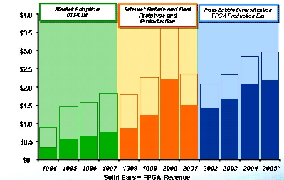 图1 PLD市场(单位:10亿美元 实心条柱是FPGA的市场)
