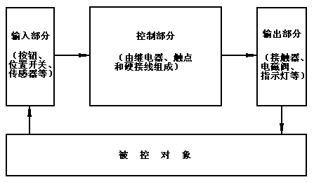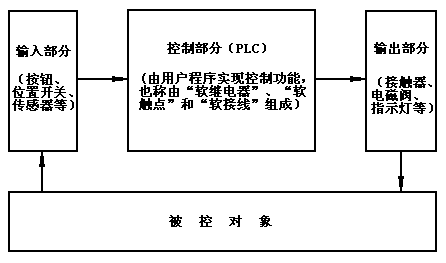 图1 电器控制系统的组成 其中输入部分是由各种输入设备,如按钮、位置开关及传感器等组成;控制部分是按照控制要求设计的,由若干继电器及触点构成的具有一定逻辑功能的控制电路;输出部分是由各种输出设备,如接触器、电磁阀、指示灯等执行元件组成。电器控制系统是根据操作指令及被控对象发出的信号,由控制电路按规定的动作要求决定执行什么动作或动作的顺序,然后驱动输出设备去实现各种操作。由于控制电路是采用硬接线将各种继电器及触点按一定的要求连接而成,所以接线复杂且故障点多,同时不易灵活改变。 2. PLC控制系统的组成 由PLC构成的控制系统也是由输入、输出和控制三部分组成,如图2所示。