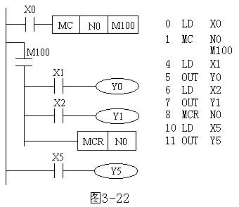 图1 主控指令的使用 MC、MCR指令的使用说明: 1)MC、MCR指令的目标元件为Y和M,但不能用特殊辅助继电器。MC占3个程序步,MCR占2个程序步; 2)主控触点在梯形图中与一般触点垂直(如图3-22中的M100)。主控触点是与左母线相连的常开触点,是控制一组电路的总开关。与主控触点相连的触点必须用LD或LDI指令。 3)MC指令的输入触点断开时,在MC和MCR之内的积算定时器、计数器、用复位/置位指令驱动的元件保持其之前的状态不变。非积算定时器和计数器,用OUT指令驱动的元件将复位,如图3-22中当X0断开,Y0和Y1即变为OFF。 4)在一个MC指令区内若再使用MC指令称为嵌套。嵌套级数最多为8级,编号按N0→N1→N2→N3→N4→N5→N6→N7顺序增大,每级的返回用对应的MCR指令,从编号大的嵌套级开始复位。 |