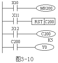 图1 通用型16位增计数器 (2)32位增/减计数器(C200~C234) 共有35点32位加/减计数器,其中C200~C219(共20点)为通用型,C220~C234(共15点)为断电保持型。这类计数器与16位增计数器除位数不同外,还在于它能通过控制实现加/减双向计数。设定值范围均为-214783648~-+214783647(32位)。 C200~C234是增计数还是减计数,分别由特殊辅助继电器M8200~M8234设定。对应的特殊辅助继电器被置为ON时为减计数,置为OFF时为增计数。 计数器的设定值与16位计数器一样,可直接用常数K或间接用数据寄存器D的内容作为设定值。在间接设定时,要用编号紧连在一起的两个数据计数器。 如图2所示,X10用来控制M8200,X10闭合时为减计数方式。X12为计数输入,C200的设定值为5(可正、可负)。设C200置为增计数方式(M8200为OFF),当X12计数输入累加由4→5时,计数器的输出触点动作。当前值大于5时计数器仍为ON状态。只有当前值由5→4时,计数器才变为OFF。只要当前值小于4,则输出则保持为OFF状态。复位输入X11接通时,计数器的当前值为0,输出触点也随之复位。