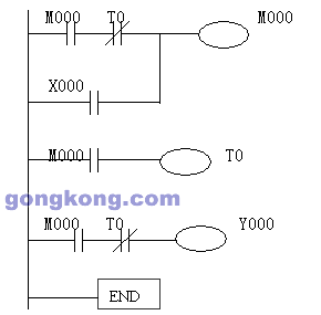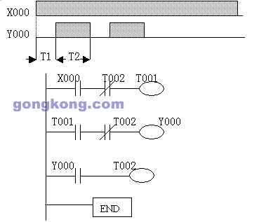 运用定时器还可构成振荡电路,如根据下面的时序图,我们可用两个定时器T001、T002构成振荡电路,其梯形图如下: