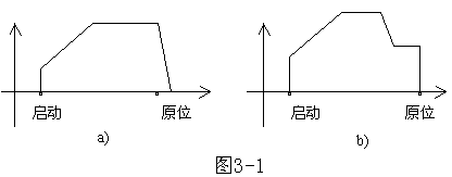 在机械工作运行过程中工作的速度与精度往往存在矛盾,为提高机械效率而提高速度时,停车控制上便出现了问题。所以进行定位控制是十分必要的。举一个简单的例子,电机带动的机械由启动位置返回原位,如以最快的速度返回,由于高速停车惯性大,则在返回原位时偏差必然较大,如图1a所示;若采用如图1a所示的方式先减速便可保证定位的准确性。